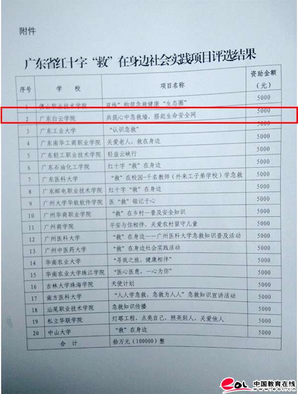 中国教育在线讯 近日,从《关于下达2018年广东省“红十字‘救’在身边”社会实践项目经费的通知》文件获悉,广东白云学院红十字协会申报的“共筑心中急救墙,搭起生命安全网”红十字青少年社会实践项目获批成功并给予5000元资助。