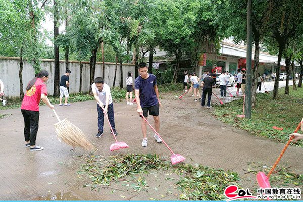 学校操场周边的树木有的树干被折断了,有的还被连根拔起,学校总务工作人员迅速将折断的树枝砍掉,运走吹落的树枝,消除安全隐患;大量的树叶被吹落,铺满了校道、操场,堵塞了下水道,参与清理的师生撸起袖子,认真打扫校园每一个角落,甚至对于有些用扫把难以清理干净的下水道,他们直接用双手捧起了一堆堆的树叶;台风将校园里一些自行车吹得东倒西歪,大家认真将每辆自行车扶起来并摆放整齐……“山竹”无情,白云有爱,师生们正用自身行动温暖整个校园。