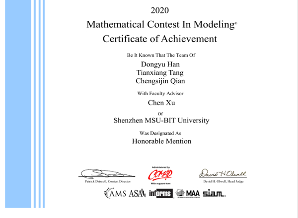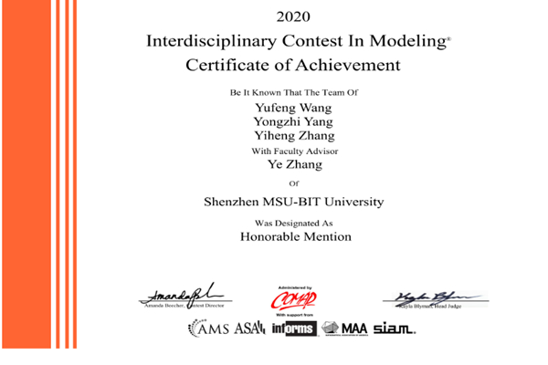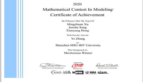 中国教育在线讯 近日,2020年美国大学生数学建模竞赛(MCM/ICM)结果正式公布,深圳北理莫斯科大学代表队荣获一等奖(Meriterious Winner)1项、二等奖(Honorable Mention)2项、成功参赛奖(Successful Participant)4项。这是学校首次参加国际性数学建模竞赛并取得佳绩。