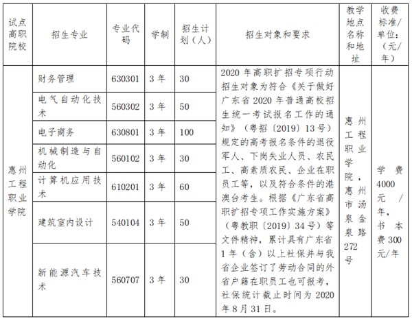 学制为3年,社会人员学历提升试点班教学地点设在惠州工程职业学院校本部。通过高职扩招专项行动录取的考生在2020年秋季入学,试点班学生完成学业符合惠州工程职业学院毕业条件和要求的,可获得全日制专科毕业证书。