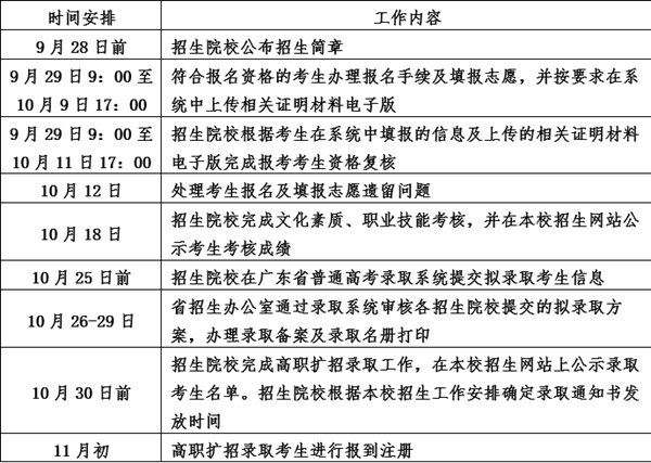 考生登录广东省高职扩招报名及志愿填报系统(http://www.eeagd.edu.cn/pgks),根据系统指引阅签诚信承诺书,填写注册信息、报名信息及志愿信息、联系方式、个人简历、家庭关系等信息,获取报名号、绑定手机号,通过微信小程序采集相片并经核对信息无误后根据实际按照要求上传相关证明材料电子版。高职扩招报名及志愿填报工作全部在网上进行,时间为9月29日9:00至10月9日17:00,逾期不再办理相关手续。