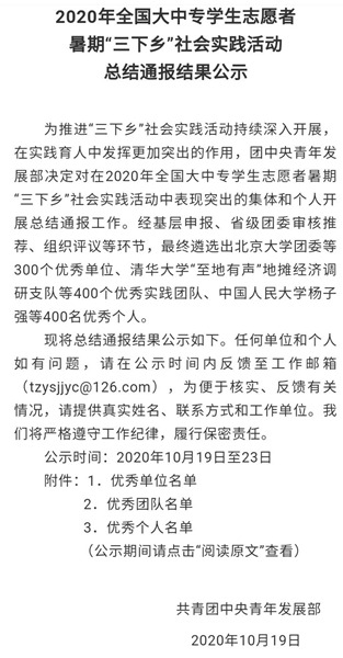 2020年全国大中专学生志愿者暑期“三下乡”社会实践活动总结通报结果公示