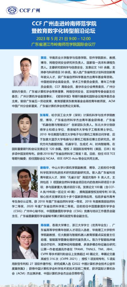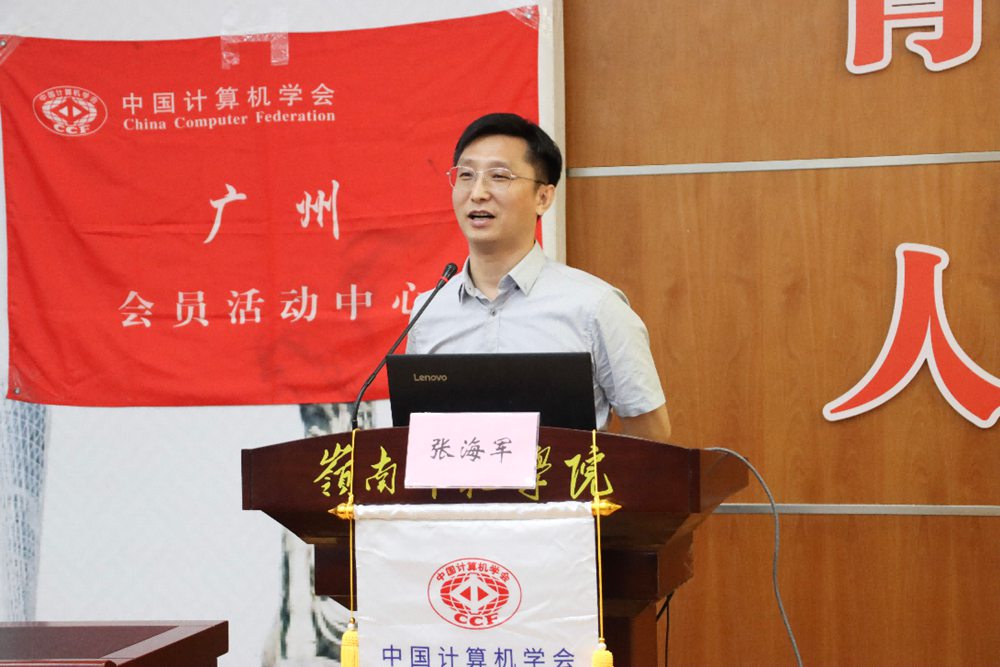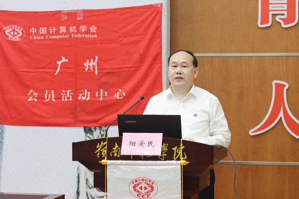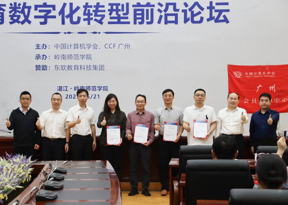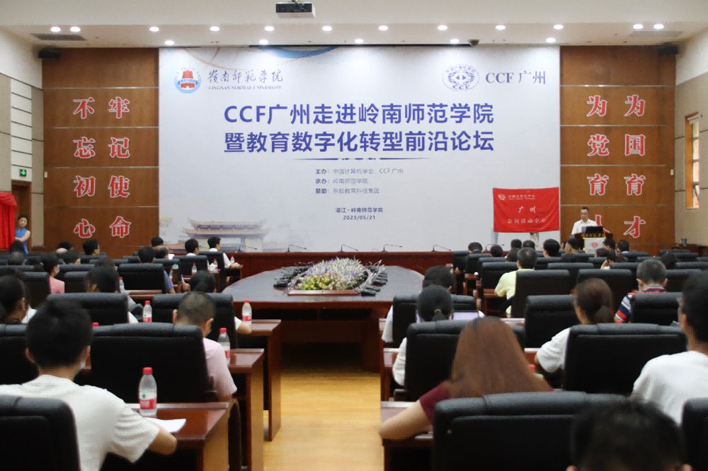 5月21日上午,CCF广州走进岭南师范学院暨教育数字化转型前沿论坛在岭南师范学院国际会议厅举行,CCF广州委员、岭南师范学院校长阳爱民教授,CCF理事、CCF广州主席、华南理工大学研究生院常务副院长许勇教授,湛江市政数局叶晖总工程师,CCF广州秘书长、华南师范大学郝天永教授,CCF广州执委、华南农业大学数学与信息学院院长黄琼教授,哈尔滨工业大学(深圳)张海军教授,中山大学计算机学院谢晓华副教授,华南理工大学软件学院陈俊颖副教授, CCF YOCSEF广州前主席、华南农业大学黄栋副教授,岭南师范学院计算机与智能教育学院杨俊杰院长、李海文书记,以及来自CCF深圳、广州木木信息科技、传智教育等的企业代表、岭南师范学院教师和学生,共计150余人参加了本次会议。东软教育科技集团提供赞助。