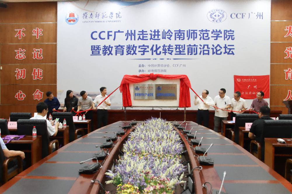 之后举行了揭牌仪式,岭南师范学院阳爱民校长、杨俊杰院长,湛江市政数局叶晖总工程师,CCF广州分部秘书长郝天永、以及四位主题报告嘉宾共同为“岭南师范学院教育数字化产业学院”和“岭南师范学院教育数字化转型研究中心”揭牌。