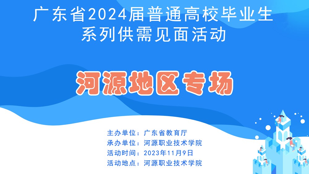 为深入贯彻党的二十大精神,全面落实党中央、国务院“稳就业”“保就业”决策部署,全力促进高校毕业生顺利就业、尽早就业,根据广东省教育厅统一部署,广东省2024届普通高校毕业生系列供需见面会(河源地区专场)定于2023年11月9日在河源职业技术学院举办。现特邀请贵单位前来参会,有关事项通知如下: