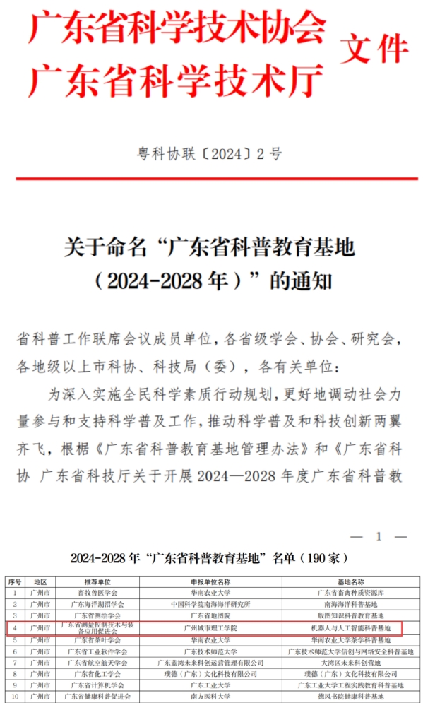 1月26日,广州城市理工学院获悉广东省科协、广东省科技厅发布《关于命名“广东省科普教育基地(2024-2028年)”的通知》(粤科协联〔2024〕2号),经省科普工作联席会议有关成员单位,有关地级以上市科协、科技局(委),省级学会、协会、研究会推荐,省科协、省科技厅组织专家评审并公示,广州城市理工学院“机器人与人工智能科普基地”成功获评“广东省科普教育基地”。