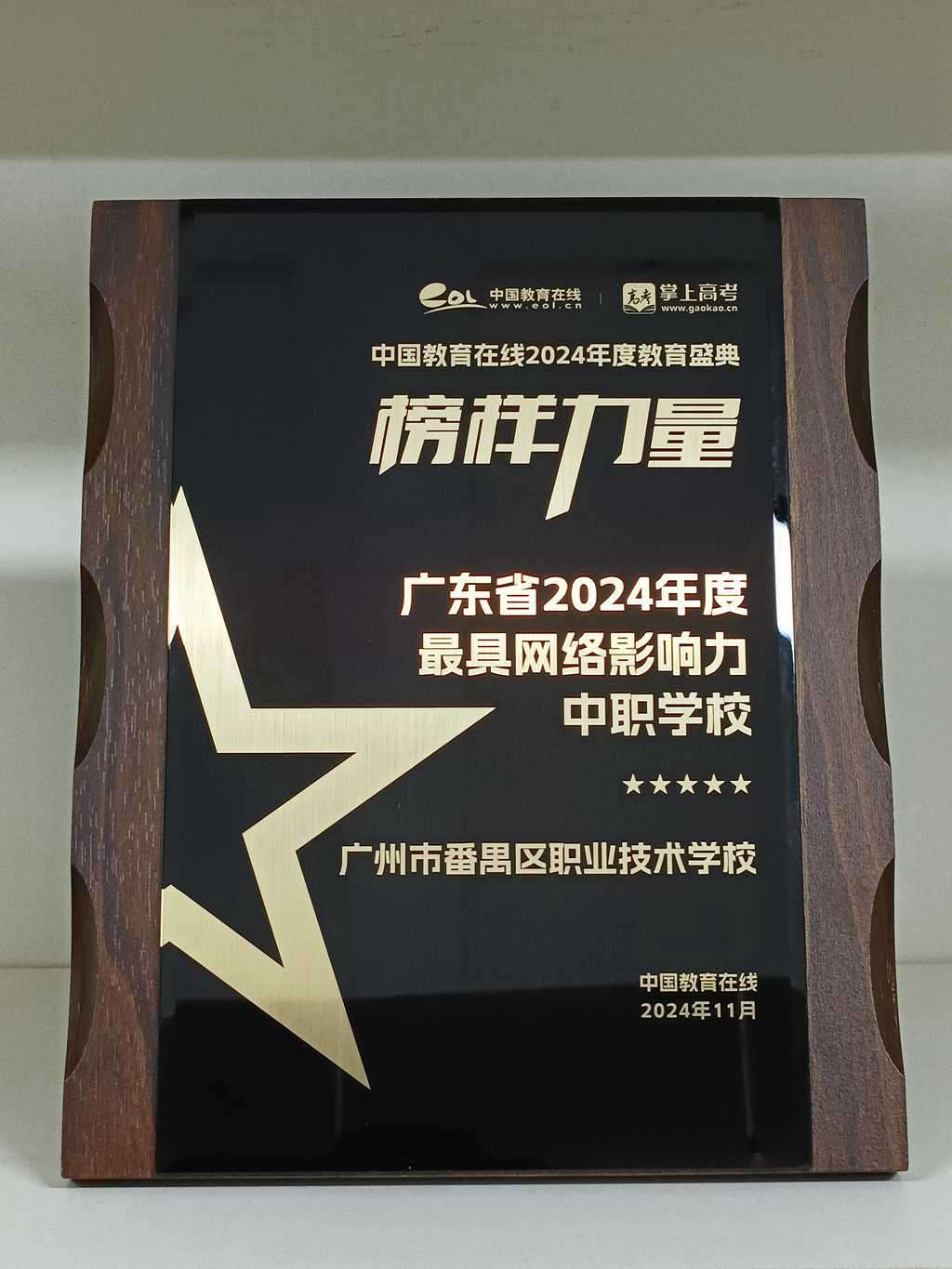 近日,中国教育在线“榜样力量·2024年度教育盛典”优秀案例公布。广州市番禺区职业技术学校凭借在网络领域的卓越表现与深远影响力,荣获 “广东省2024年度最具网络影响力中职学校”的称号。