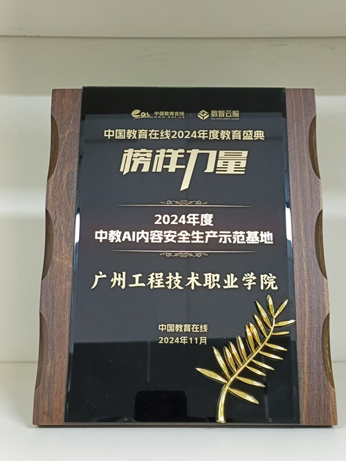 近日,中国教育在线“榜样力量·2024年度教育盛典”优秀案例公布。广州工程技术职业学院凭借在新媒体领域的卓越成就与深远影响力,荣获 “2024年度中教AI内容安全生产示范基地”。