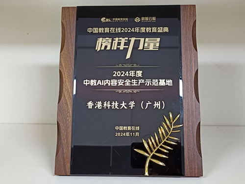 近日,中国教育在线“榜样力量·2024年度教育盛典”优秀案例公布。香港科技大学(广州)凭借在新媒体领域的卓越成就与深远影响力,荣获 “2024年度中教AI内容安全生产示范基地”。