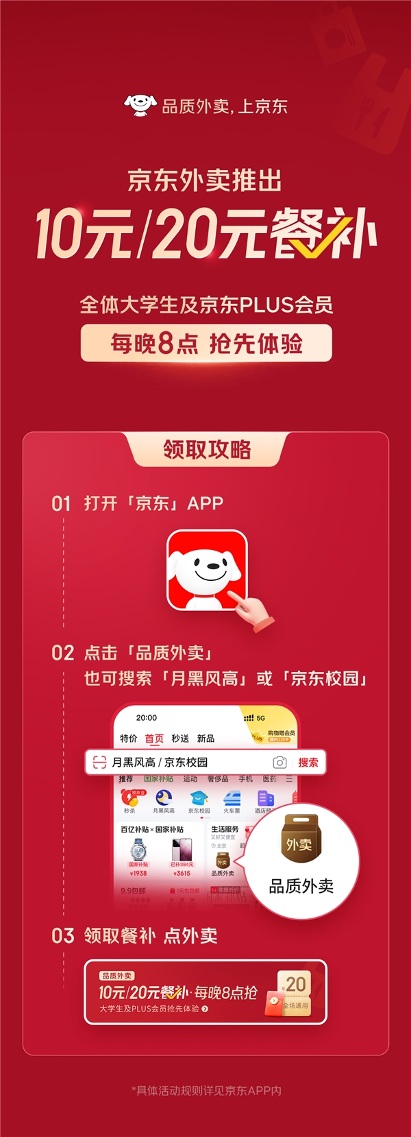 2月27日,京东外卖宣布推出“10元/20元餐补随机领”优惠活动,“满15元减10元”、“满40元减20元”两种大额餐补优惠券每晚8点即可随机领取,首批覆盖通过京东认证的大学生用户及京东PLUS会员。即日起每晚8点,可通过京东App首页“品质外卖”频道入口领取,也可以在京东App搜索“月黑风高”或“京东校园”进行领取,餐补优惠的使用范围包含京东外卖平台上线的所有餐饮外卖门店。大学生用户可在京东App搜索“学生认证”,完成认证后即可参与餐补领取。