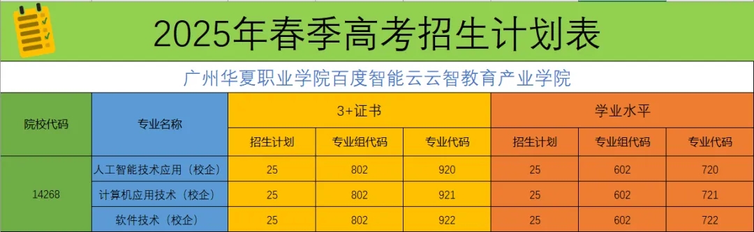 广州华夏职业学院联合人工智能产业龙头百度共建“百度智能云云智教育产业学院”(以下简称产业学院),2025年春季高考开设人工智能技术应用、计算机应用技术、软件技术专业。春季高考共招生150人,其中人工智能技术应用专业50人,计算机应用技术专业50人,软件技术专业50人。