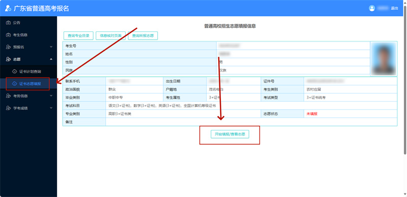选择类型【高考报名】进入系统后(学考和3+都选择该项),点击左侧菜单栏【志愿】—【证书/学业志愿填报】,核对个人信息,点击【开始填报/查看志愿】,进入志愿填报操作。