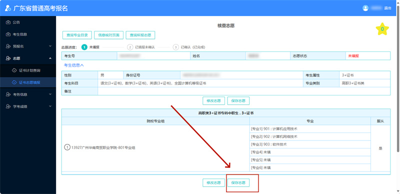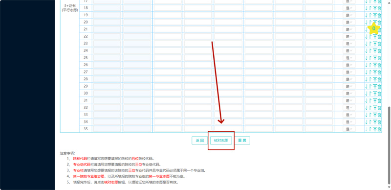 填完志愿后,点击【核对志愿】—【保存志愿】。如需修改志愿,点 击【修改志愿】进行修改。“核对志愿”有误时,系统会出现红色警告字符,表明不符合专业招生条件,需按提示修改志愿,否则无法进行志愿保存。