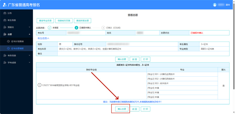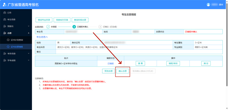 ②在未确认志愿前,可多次修改所填报的志愿。在首次“确认志愿”后,只有2次取消确认、修改志愿的机会,修改后必须再次确认,否则志愿无效。
