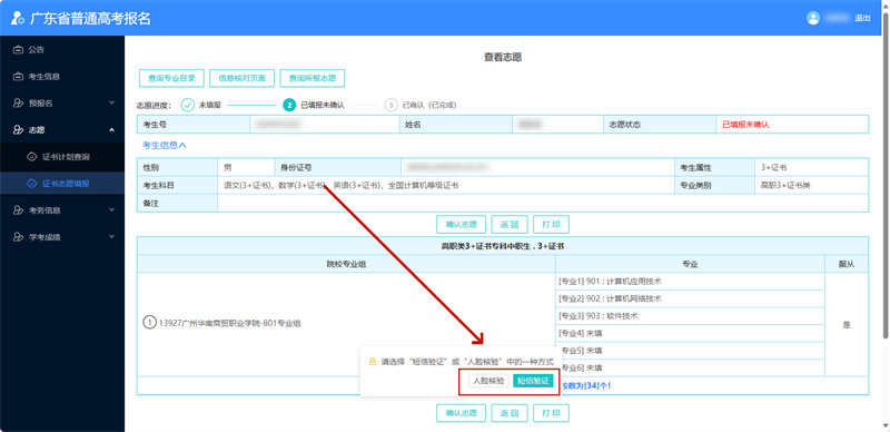 若确定不再修改志愿,即点击【确认志愿】。进入查看志愿页面,核对无误后,再次点击【确认志愿】,选择【人脸核验】或【短信验证】进行志愿确认。