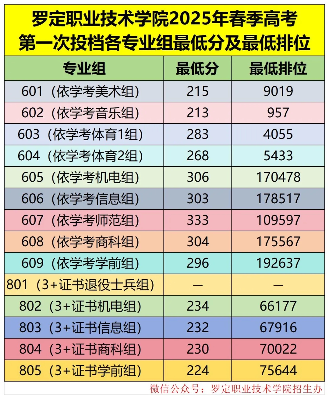 罗定职业技术学院2025年春季高考第一次投档各专业组最低分及最低排位