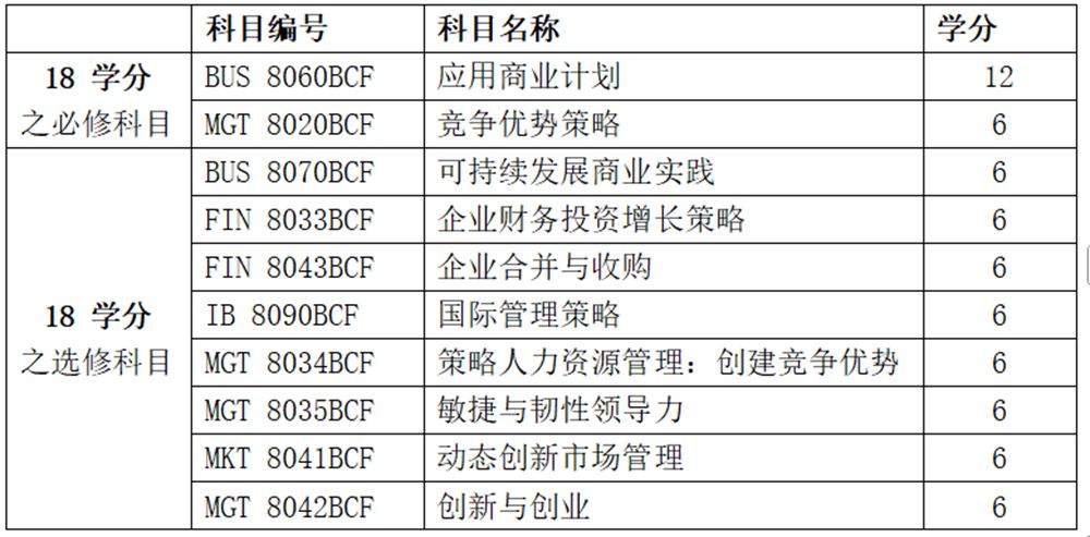 注意:循「途径一」入学的学生, 即获得认可的工商管理相关领域的硕士学位(或等同资格),必须修毕24学分,其中包括18学分的必修科目以及6学分的选修科目(即一门选修课)。