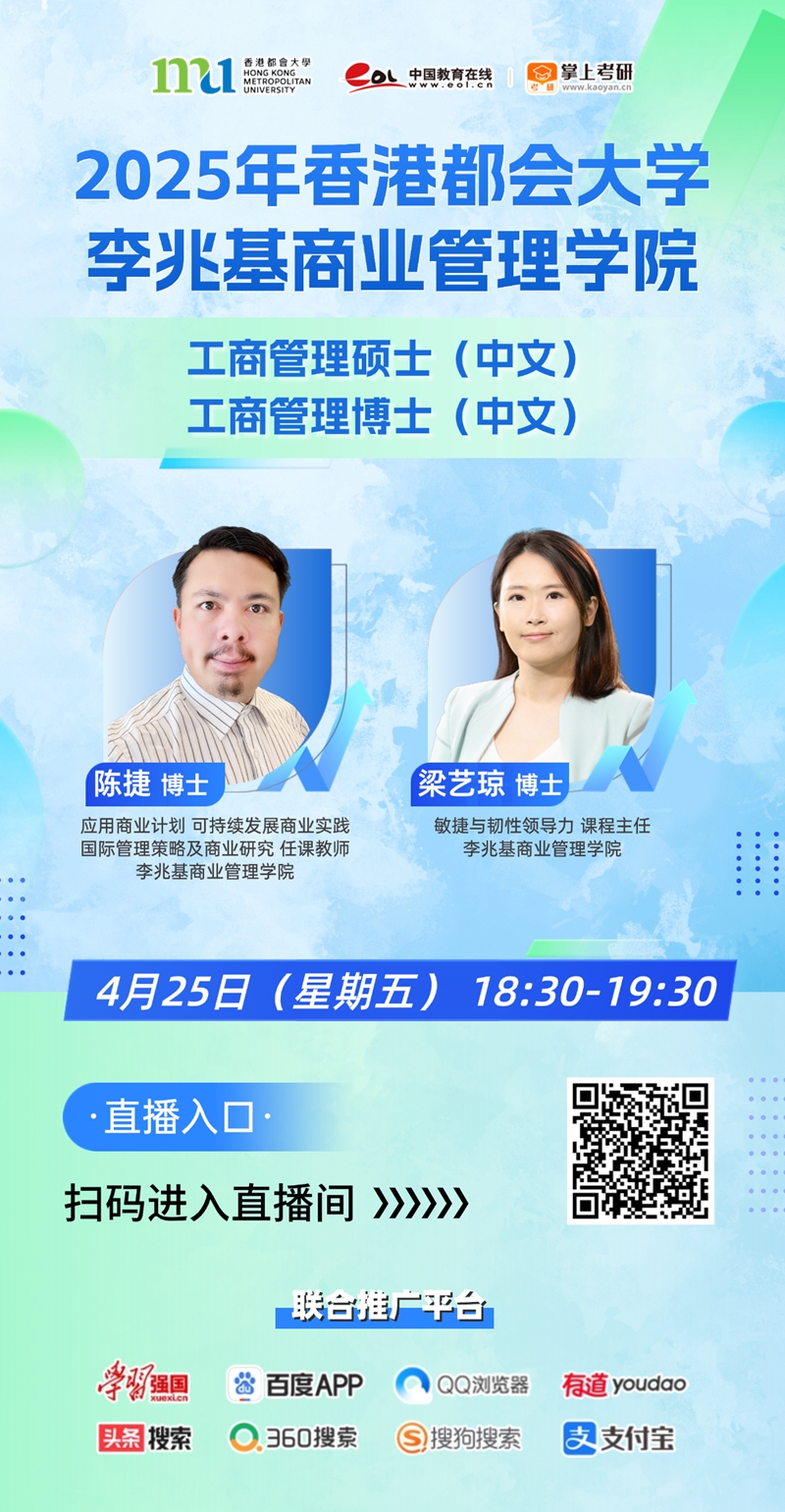 主题:2025年香港都会大学李兆基商业管理学院工商管理硕士(中文)、工商管理博士(中文)课程在线简介会