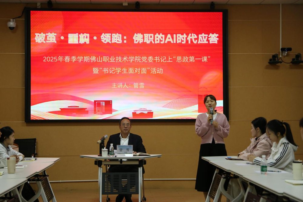 “人工智能一定是应用为王,先用为王”“推动数智化全面转型,是学校换道超车的关键之举”“三年之后,你们身上必须贴上数字化、智能化的标签”……近日,佛山职业技术学院(下称“佛职院”)以“破茧·重构·领跑:佛职的AI时代应答”为主题,举行2025年春季学期党委书记上“思政第一课”暨“书记学生面对面”活动,校党委书记管雪与30余名大一优秀学生代表展开了一场关于“人工智能”的深入交流。
