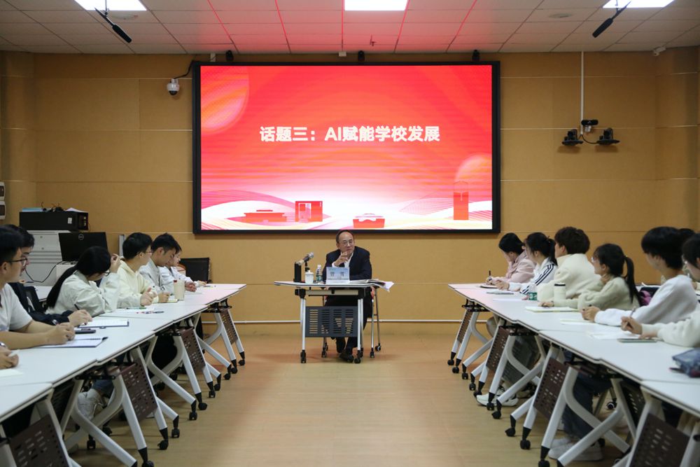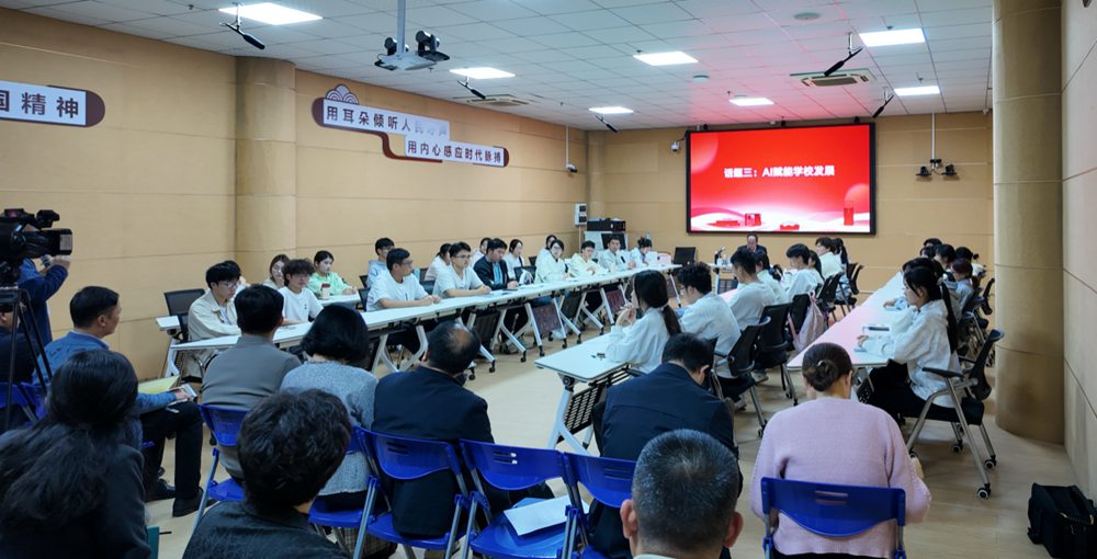 “你印象中的人工智能是什么样子的?”“学校目前开设的人工智能课大家满意度如何?”“对两三年后的人工智能大家有怎样的畅想?”围绕“认知:畅聊AI印象”“转型:感悟AI力量”“实践:AI赋能学校发展”三个话题,管雪向学生们抛出问题。