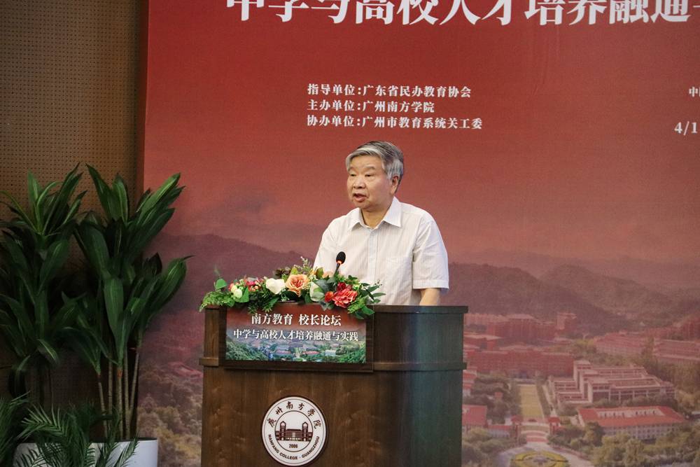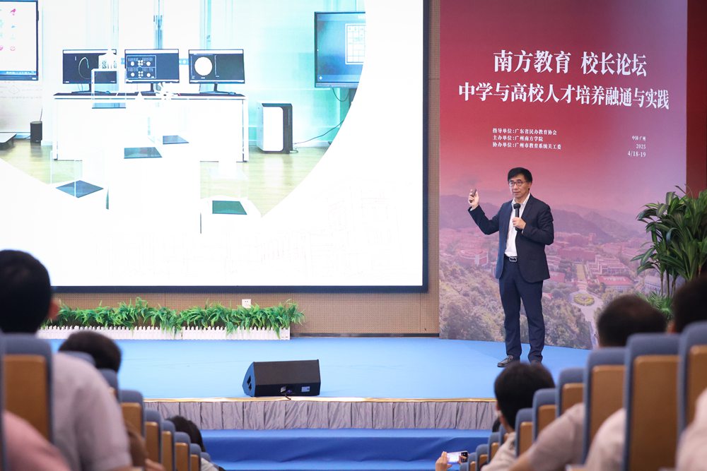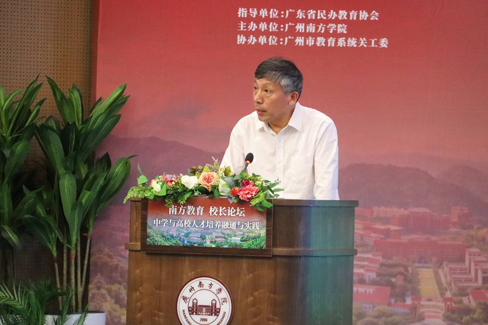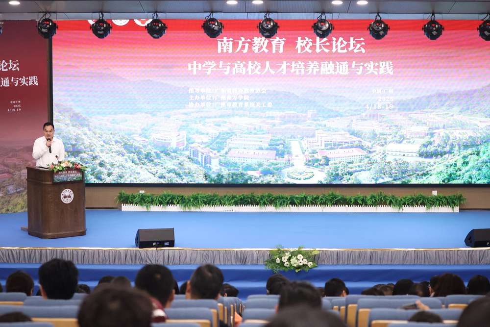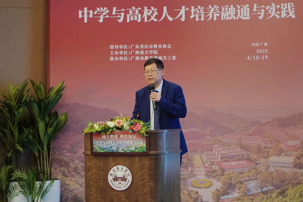 赵康会长在讲话中表示,本次论坛聚焦“中学与高校人才培养融通与实践”,是落实国家战略的“广东答卷”,更是探索教育现代化的“湾区方案”。他强调,作为全国民办高校转型发展的重要高校,广州南方学院人才培养成效显著。期待广州南方学院以此次盛会为契机,构建“中学-大学-产业”协同育人体系,依托粤港澳大湾区产业优势,深化科教产教融合,发挥民办高校机制灵活特点,培养扎根产业的高素质人才,共同绘就广东民办教育高质量发展新图景。