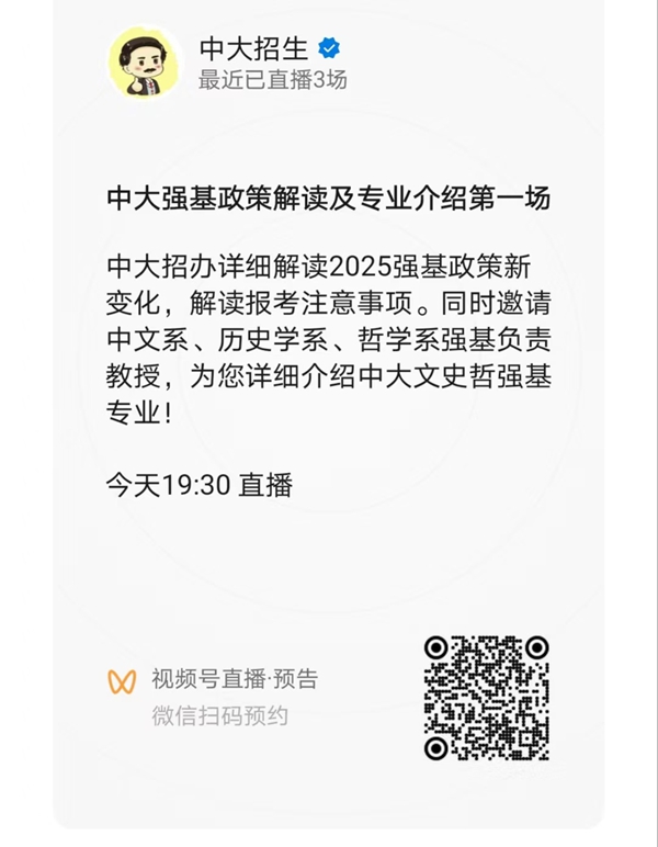 想了解更详细的强基政策及专业情况,扫描下方二维码预约强基直播专场(第一场),4月22日(周二)19:30中大招办联袂文史哲专业教授为您讲解!
