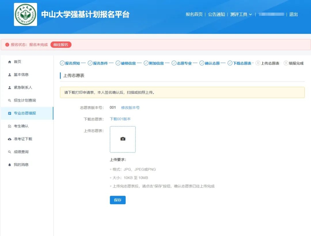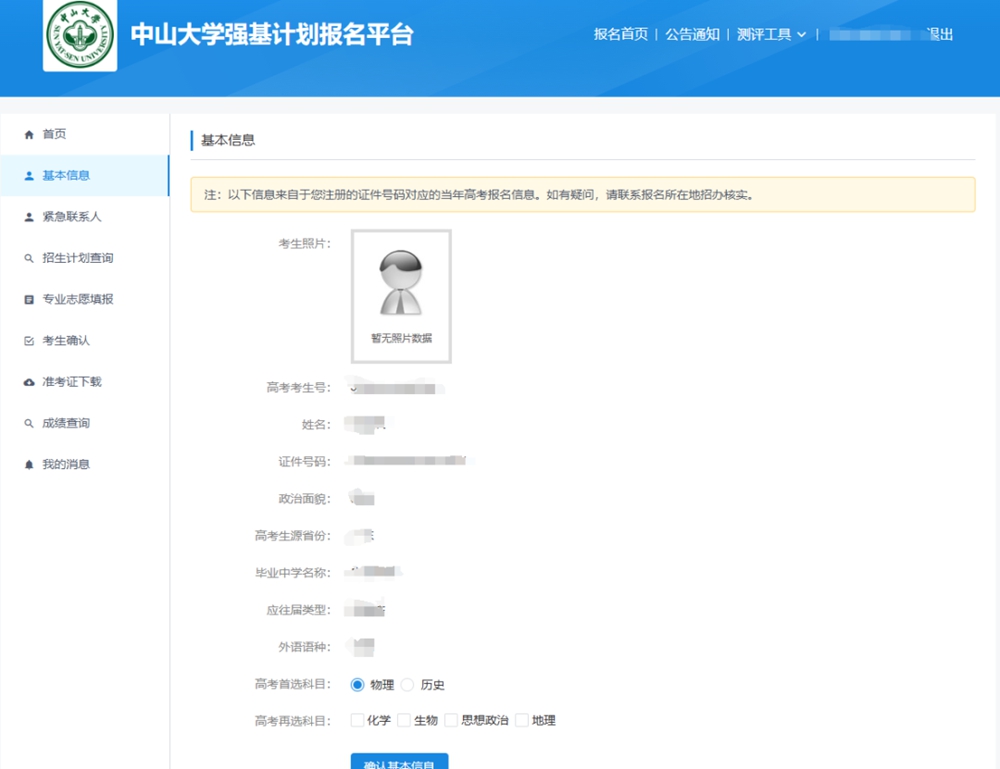 登录首页后,页面左侧有八个栏目,其中“基本信息”、“紧急联系人”、“招生计划查询”、“专业志愿填报”四栏,需要在5月10日之前处理,根据栏目内具体内容完成报名程序。
