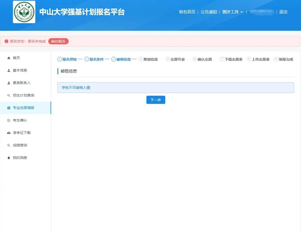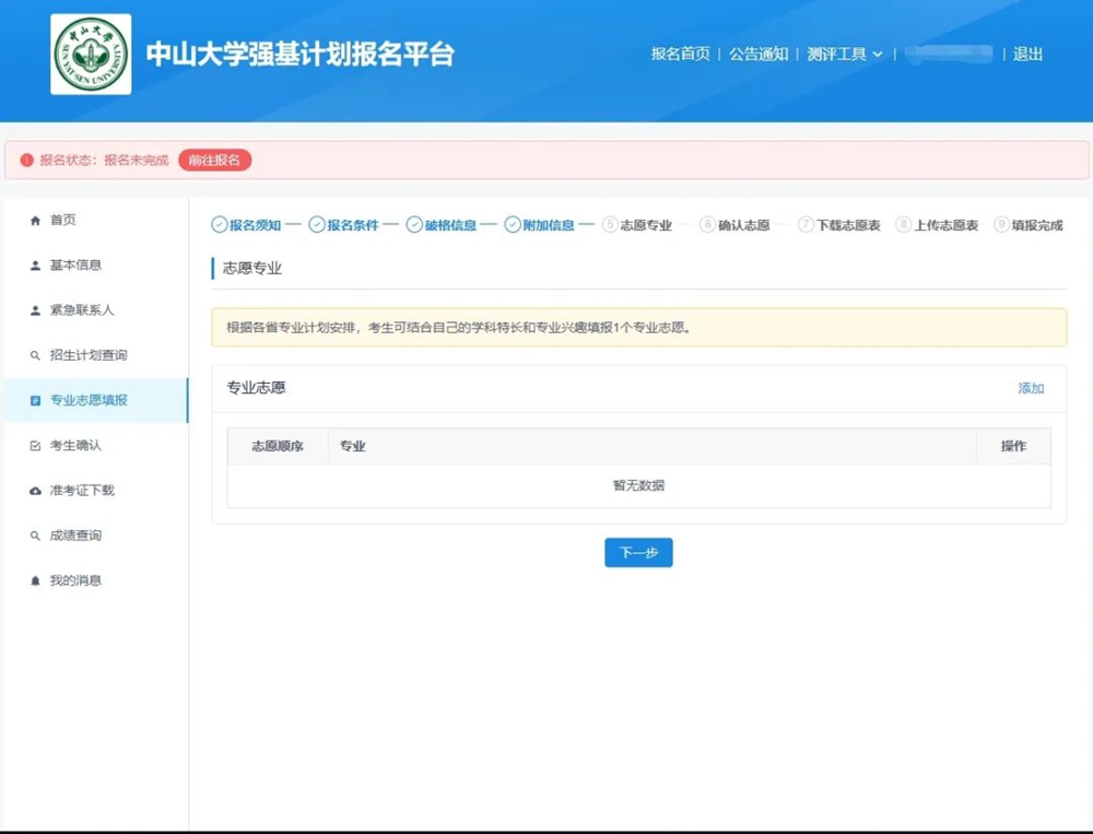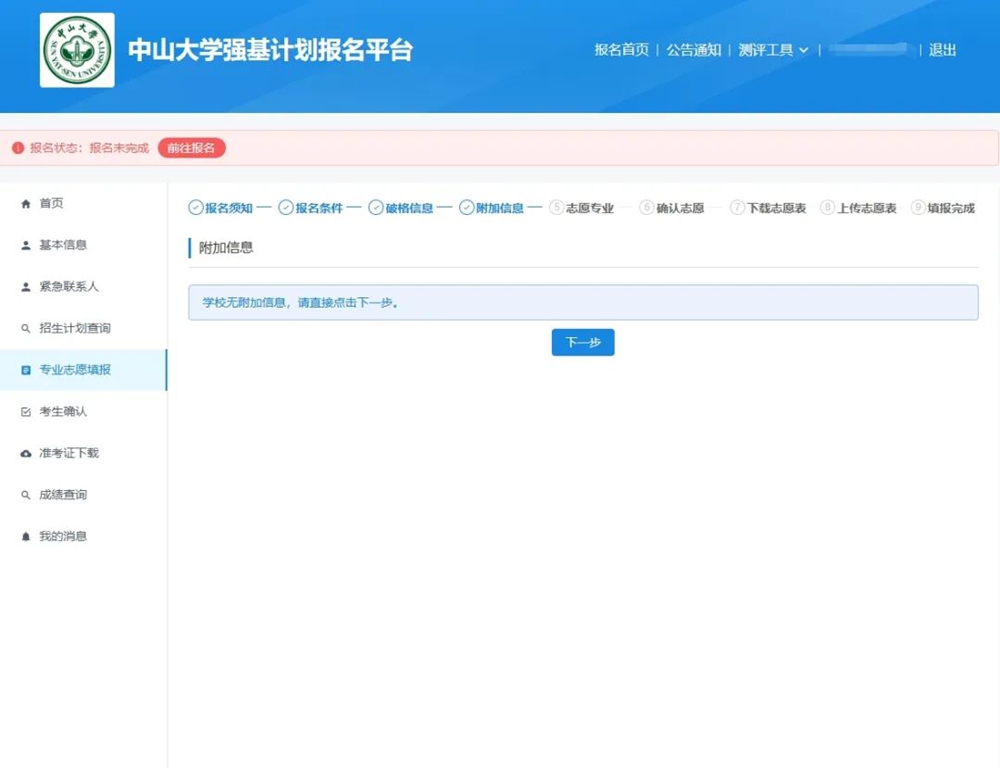 7.中山大学强基计划招生不设置竞赛获奖破格入围,也不需要提交“附加信息”,直接点“下一步”即可