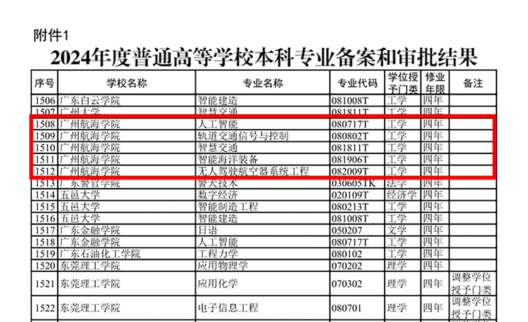 与时代同向,与世界同行。学校五个新增专业聚焦前沿科技与产业融合,涵盖高端装备制造、新一代信息技术、海洋经济、综合交通等重点领域,精准对接广州市“12218”现代产业体系需求。人工智能专业响应国家新一代信息技术发展战略,聚焦前沿算法与应用开发,致力培养智能产业发展创新人才;轨道交通信号与控制专业围绕智慧轨道建设,助力广州提升城市交通智能化水平,建设国际性综合交通枢纽;智慧交通专业融合多学科知识,服务综合交通体系的优化升级;智能海洋装备专业立足海洋经济,推动海洋装备的智能化发展,助力广东省建设“海上新广东”和广州“彰显海洋特色的现代化城市”建设;无人驾驶航空器系统工程专业面向无人机产业,契合粤港澳大湾区低空经济发展的新需求。