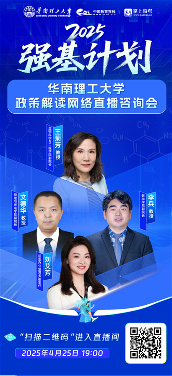 针对广大考生、家长关心的招生专业、报名流程与培养模式等热点问题,4月25日19点,华南理工大学开展2025年强基计划政策解读网络直播咨询会,届时,我校招生办以及学院老师将在线解读2025强基计划政策,深度剖析招生亮点,并现场解答考生及家长疑问!