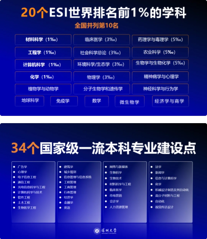 深圳大学学科门类齐全、综合性强,涵盖哲学、文学、经济学、法学、教育学、理学、工学、管理学、医学、历史学、艺术学、农学等12个学科门类。
