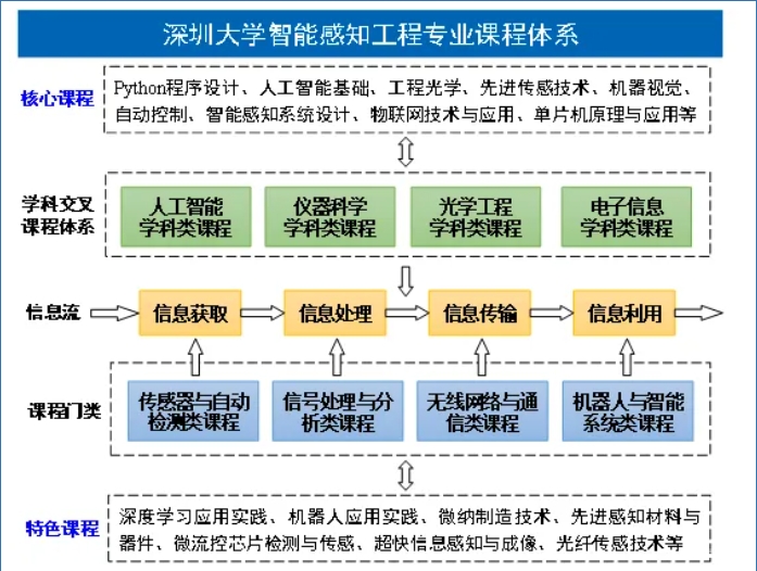 深圳大学智能感知工程专业致力于服务国家战略需求和粤港澳大湾区经济社会发展需要,依托射频异质异构集成全国重点实验室、光电子器件与系统教育部/广东省重点实验室等18个国家级、省部级、市级科研平台,面向科技创新和战略性新兴产业发展对智能感知工程领域人才的迫切需求,借助物理与光电工程学院一流的教师队伍、深厚的办学经验及先进的科研平台,构建特色化“人工智能+X”的新工科人才培养体系。借助粤港澳大湾区智能感知落地的重要空间载体优势,深化与人工智能、智能制造等领域领军企业的合作,以“产、学、研、创”四位一体为核心要素,推进科产教融合人才培养新模式。