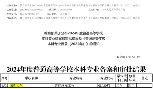 近日,教育部印发通知,公布2024年度普通高等学校本科专业备案和审批结果。深圳大学新增“智能感知工程”本科专业,学位授予门类是工学,修业年限四年,拟于2025年开始招生。