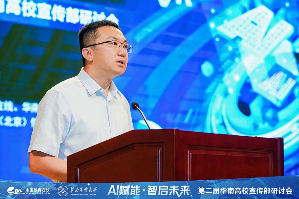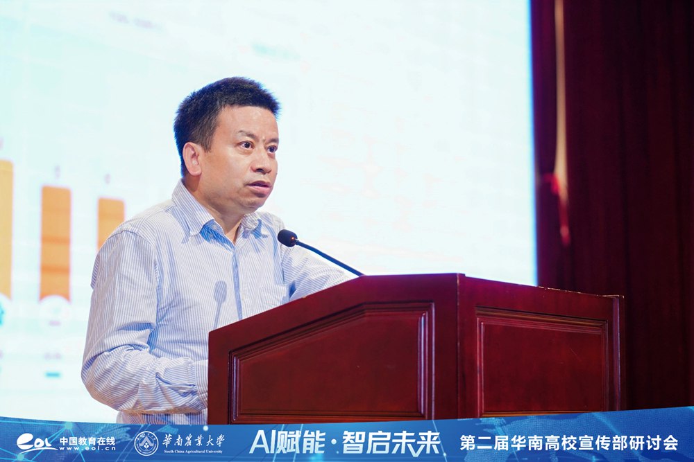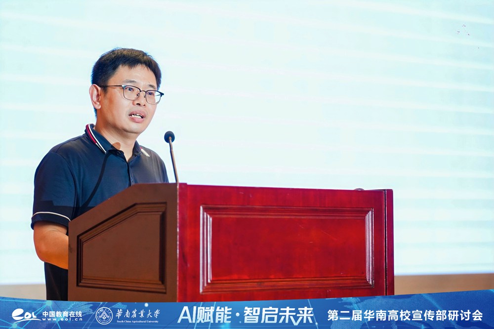 华南农业大学党委副书记陈磊对参会代表表示热烈欢迎,并指出AI技术正深刻改变教育生态,高校宣传如何借力创新、落实立德树人,是我们共同的时代课题。作为“三全育人”试点高校,华农积极构建大思政格局,打造立体化宣传矩阵,传播力、影响力位居全国前列。未来,华农将与各兄弟院校携手,探索AI赋能宣传的新路径,共育时代新人,共展高校形象。