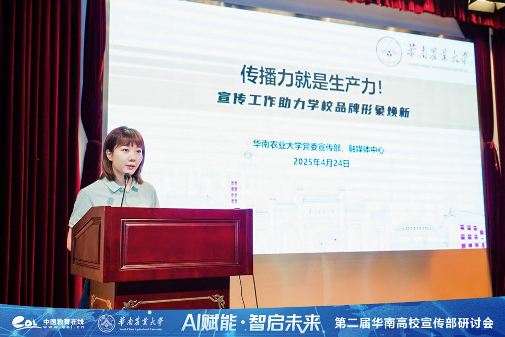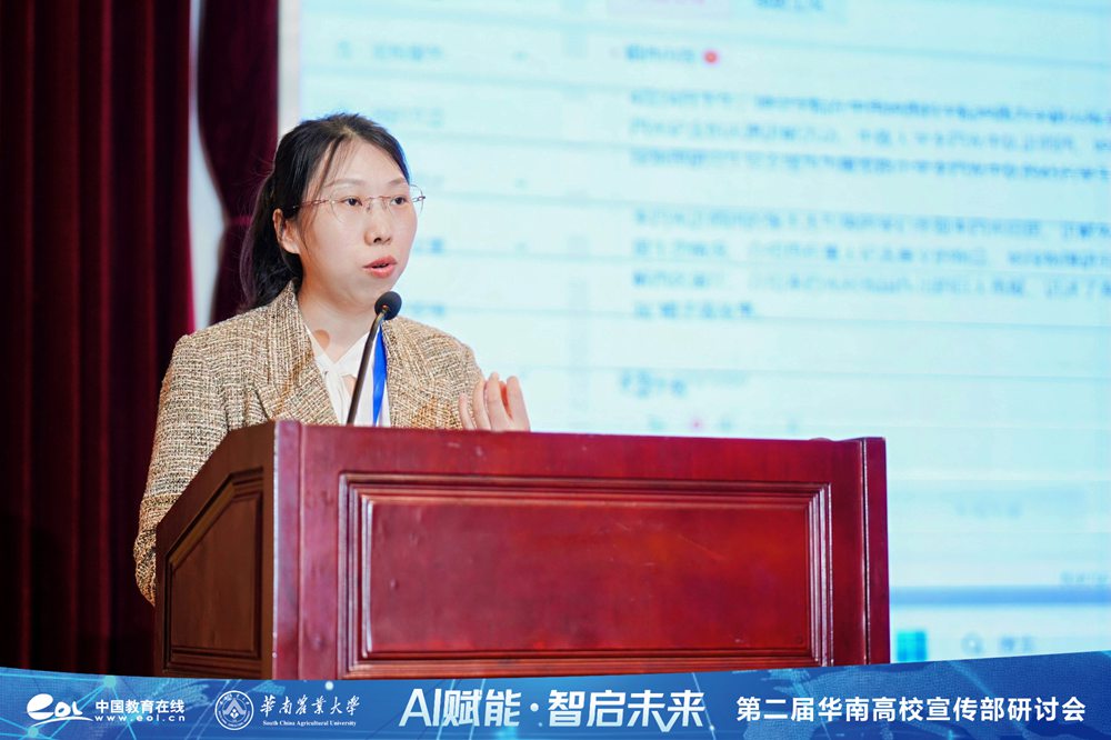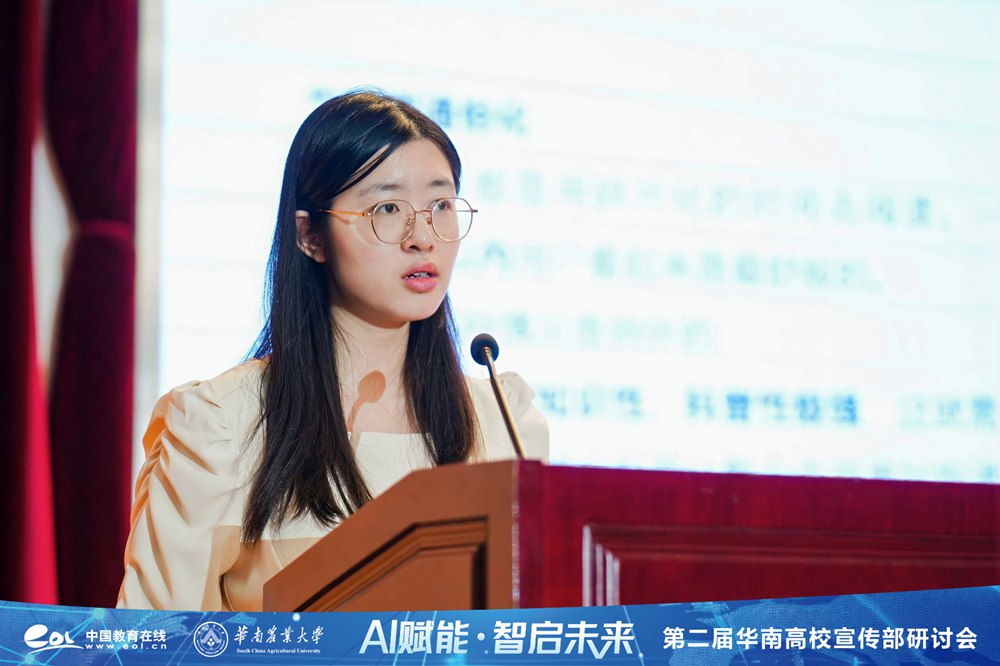 华南农业大学党委宣传部(党委统战部)副部长陈芃辰以《传播力就是生产力!宣传工作助力高校品牌形象焕新》为题,阐述宣传工作对高校品牌塑造的重要性。她围绕“融合发展:加强平台队伍建设”“强化特色:打造品牌化宣传”“彰显形象:实现传播力跃升”等方面,提出高校可以通过加强专题策划、创新形式内容、凸显学校特色,积极开展有组织的宣传,助力学校形象的建构和传播,提升社会知名度与美誉度。