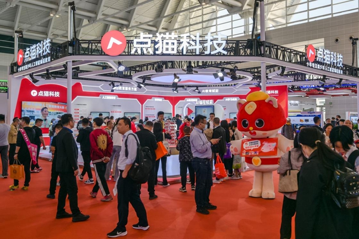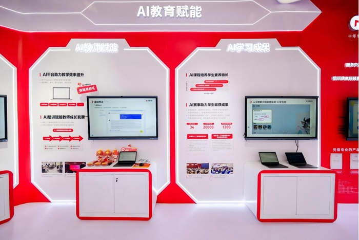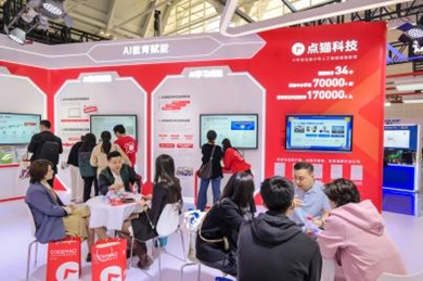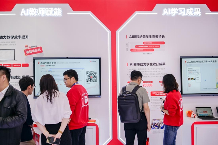 展会现场,点猫科技从平台、培训、课程、赛事四方面展示了AI多维度、全方位赋能教育发展的创新成果和应用案例。