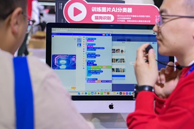 AI模型训练,指先给计算机“看”海量图片/数据进行标记,并在训练中不断调整参数,直到它能准确识别。通过点猫科技编程软件,用户可以调用或者自主训练AI模型。如在现场展出的利用Kitten N制作的AI图片分类器《猫狗识别》中,通过一定量的数据输入后,使用Kitten N的摄像头识别图片素材,AI分类器即可根据训练出的模型来自动识别有多少概率为猫或狗。