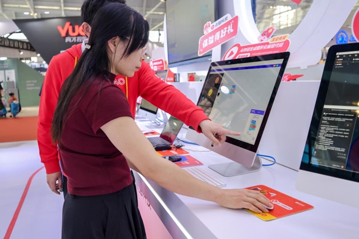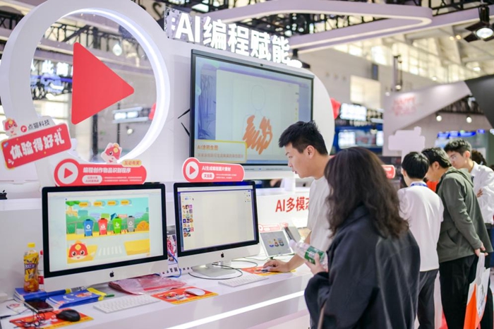 目前,点猫科技编程软件已全面接入AI能力,通过AI多场景、多环节赋能编程创作。AI协同全流程开发、多模态生成式AI创作、计算机视觉AI处理、AI模型训练……展会现场的AI编程赋能展区,吸引了众多观众前来体验编程创作与AI结合的无限可能!