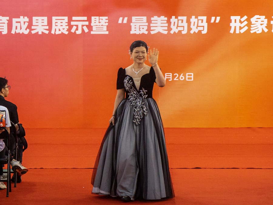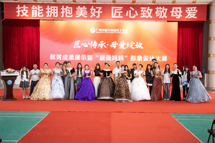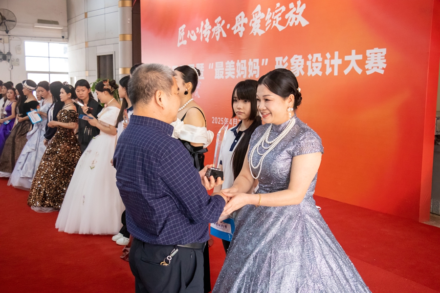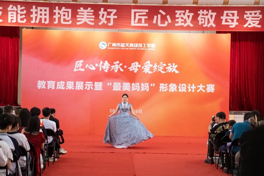“最美妈妈”形象设计大赛由学生和家长共同参与。10名形象设计专业学生亲手为妈妈量身打造红毯造型,从头饰、妆容到礼服设计,充满创意和惊喜。10位妈妈当天盛装登台走秀,从“优雅女神”到“时尚先锋”,每个造型都收获现场热烈掌声。大赛还设计了“梦想加油站”亲子对话等环节,让技能展示与情感表达同频共振。