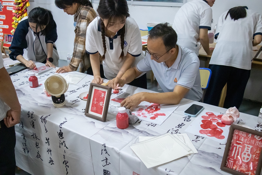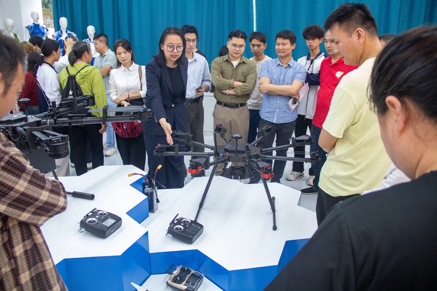 活动现场,科技感十足的“新能源汽车动力电池检测VR体验”,扎染、剪纸、漆扇等非遗艺术展示,AI创意设计作品、服装设计作品展等,吸引了众多学生和家长驻足观赏、体验,气氛热烈。