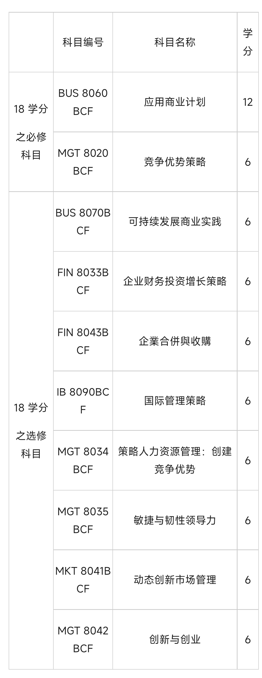 注意:循「途径一」入学的学生, 即獲得认可的工商管理相关领域的硕士学位(或等同资格),必须修毕24学分,其中包括18学分的必修科目以及6学分的选修科目(即一門選修課)。
