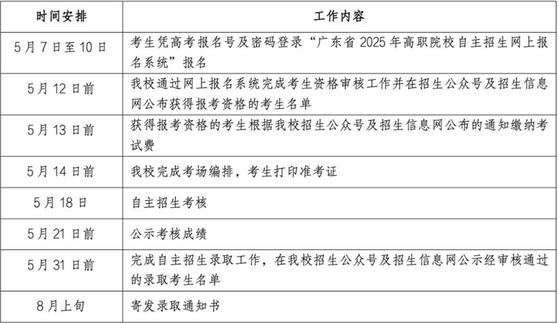 5月7日10:00至10日16:00,考生凭高考报名号及密码登录“广东省2025年高职院校自主招生网上报名系统”(下称“网上报名系统”,网址:https://pg.eeagd.edu.cn/gzks/)报名,签订《诚信考试承诺书》,选择“退役军人现代学徒制专项试点”(不分考生类型)考核方式填报志愿,缴交考试费。录入相关报名信息、上传有关证明材料(原件扫描版,下同)。考生在选择考核方式前,需认真查阅我校招生网站和招生公众号上公布的招生专业考核方式,无法确认的需向我校咨询并明确。经我校确认报考资格后,考生不得更改考核方式。
