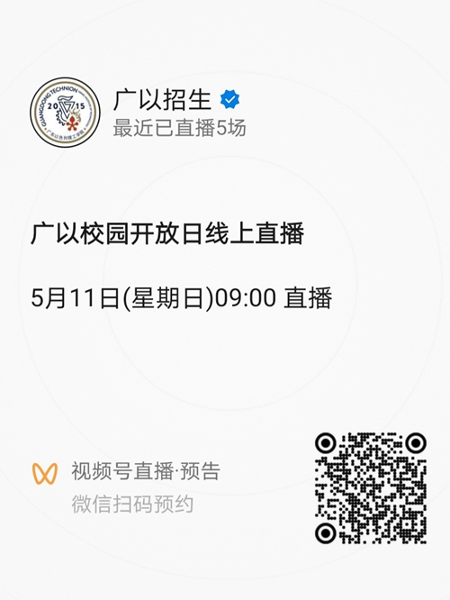 校长说广以、学子聊体验、专业面对面、实验室与校园参观等环节届时将开展线上直播,欢迎扫码预约观看,届时开播将会提醒。