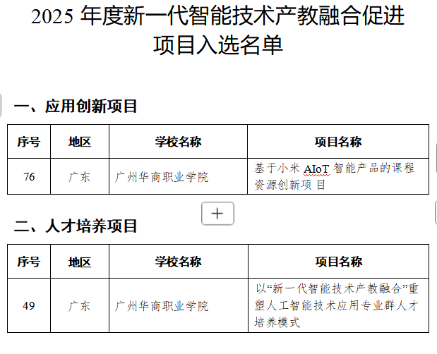 经专家遴选,最终仅有171个项目成功入选。广州华商职业学院是广东省7所高校中唯一入选新一代智能技术产教融合人才培养项目的民办高职院校。