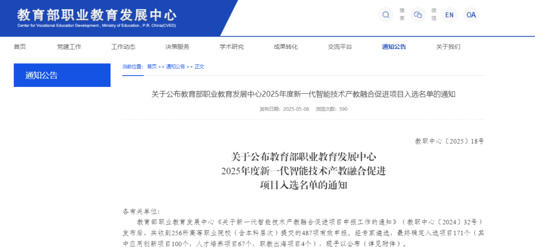 此次项目申报竞争激烈。自教育部职业教育发展中心发布《关于新一代智能技术产教融合促进项目申报工作的通知》(教职中心〔2024〕32号)以来,共吸引了256所高等职业院校(含本科层次)踊跃参与,提交的有效申报项目多达487项。