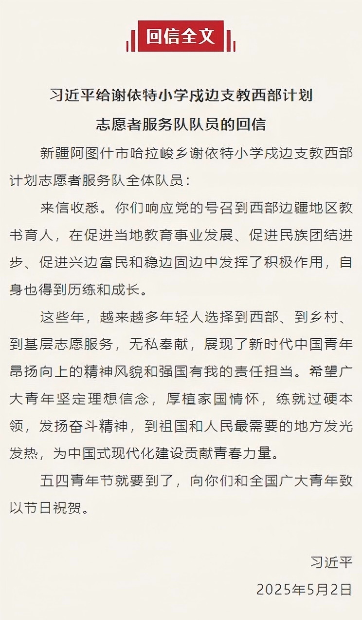 在五四青年节到来之际,中共中央总书记、国家主席、中央军委主席习近平给新疆克孜勒苏柯尔克孜自治州阿图什市哈拉峻乡谢依特小学戍边支教西部计划志愿者服务队全体队员回信,引发全国青年热烈反响。