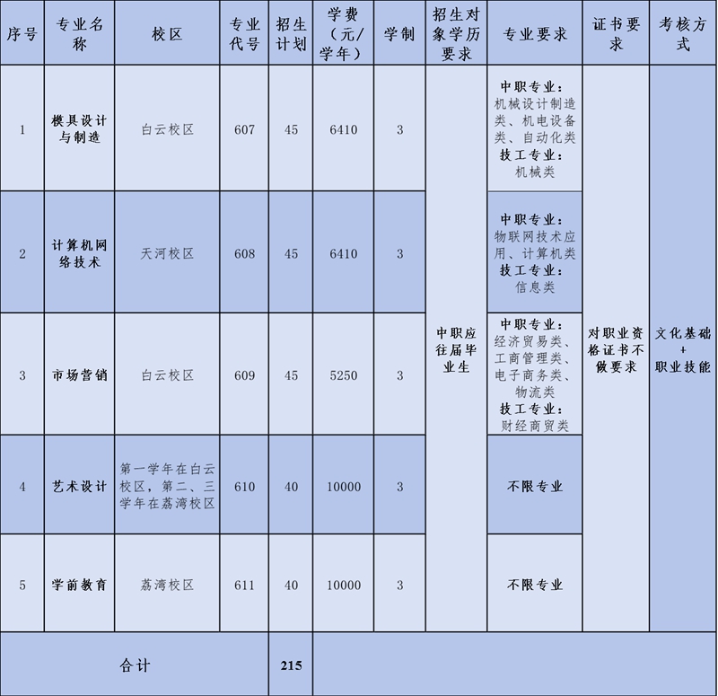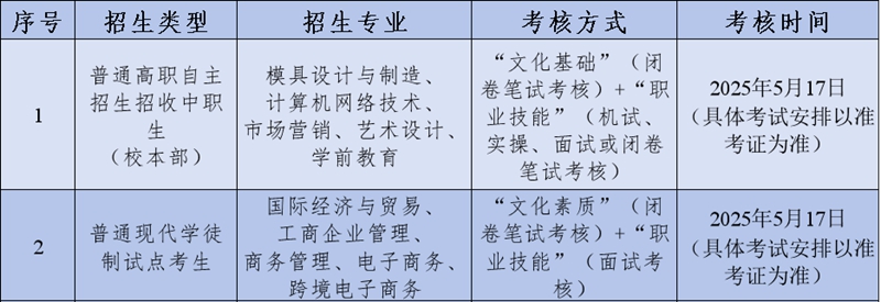 学校贯彻落实《国家职业教育改革实施方案》(国发〔2019〕4号)、《国务院关于深化考试招生制度改革的实施意见》(国发〔2014〕35号)、《教育部办公厅关于进一步完善高职院校分类考试工作的通知》(教学厅函〔2021〕36号)、《广东省人民政府关于深化考试招生制度改革的实施意见》(粤府〔2016〕17号)及《广东省教育厅关于做好2025年高等职业院校自主招生工作的通知》(粤教考函〔2025〕11号)等文件精神,2025年开展普通高职自主招生(中职考生)、普通现代学徒制试点和职业技能大赛获奖免试录取等3种招生类型,总计划365人。