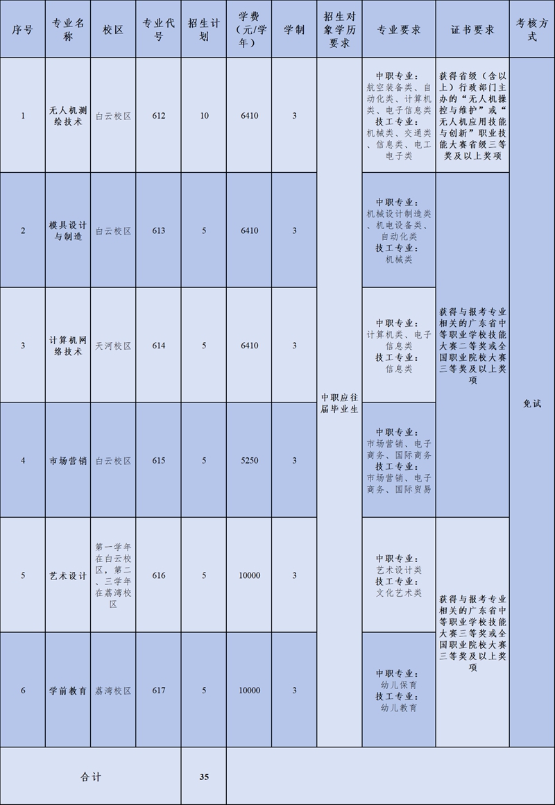 根据国家和省有关文件精神,模具设计与制造、计算机网络技术和市场营销专业免试条件为获得与报考专业相关的广东省中等职业学校技能大赛二等奖或全国职业院校大赛三等奖及以上奖项;艺术设计和学前教育专业免试条件为获得与报考专业相关的广东省中等职业学校技能大赛三等奖或全国职业院校大赛三等奖及以上奖项;无人机测绘技术专业免试条件为获得省级(含)以上行政部门主办的“无人机操控与维护”或“无人机应用技能与创新”职业技能大赛省级三等奖及以上奖项。