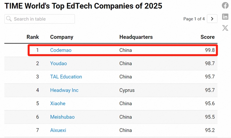 2025年5月,国际权威媒体《时代》杂志(TIME)联合全球数据研究机构Statista发布“2025全球顶尖教育科技公司”榜单,中国教育科技企业首次创造历史性突破——中国知名的人工智能和编程教育科技企业编程猫荣登榜单第一。