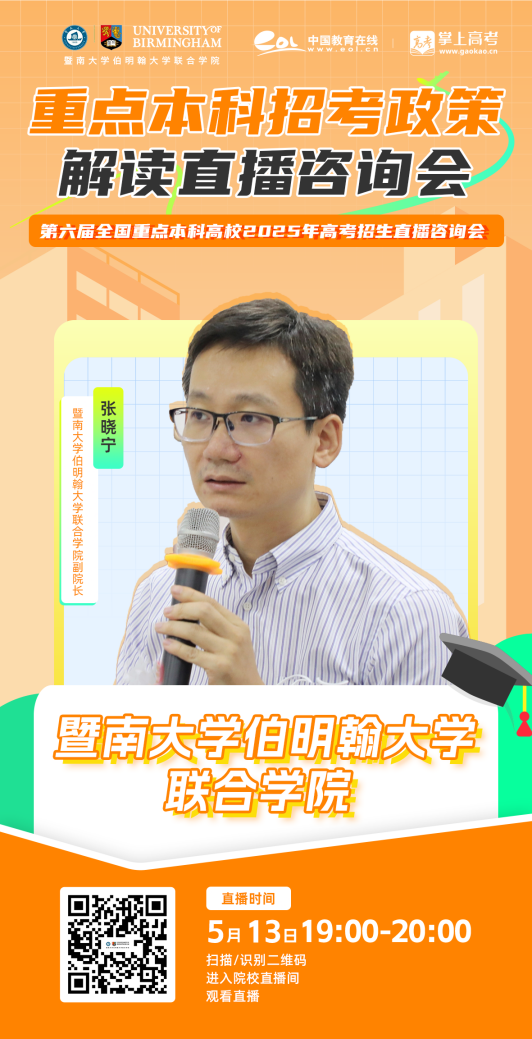 2025年高考在即,为帮助广大考生和家长全面了解学校最新招生政策,暨南大学伯明翰大学联合学院现参与中国教育在线·掌上高考于5月13日举办的“第六届全国重点本科高校2025年高考招生直播咨询会”活动,为大家带来最权威的招生政策解读。